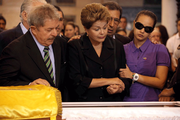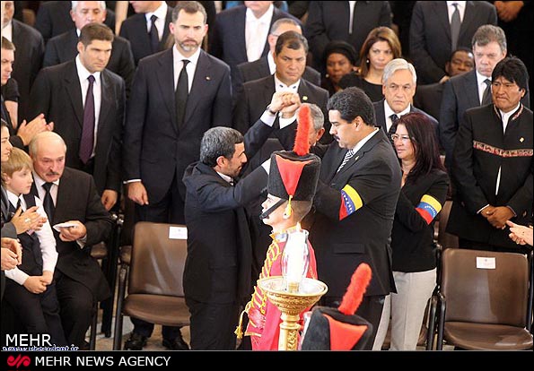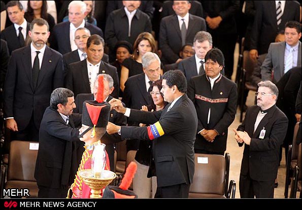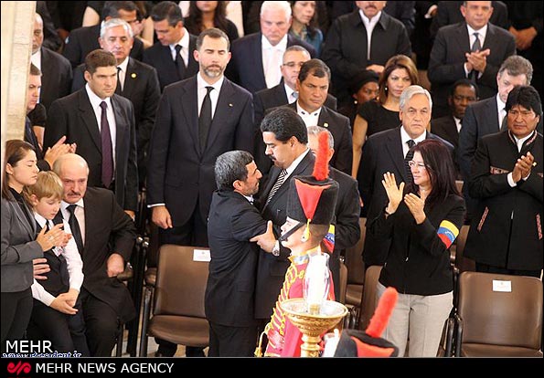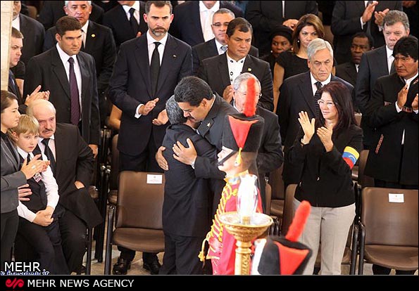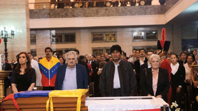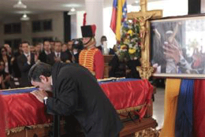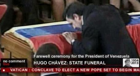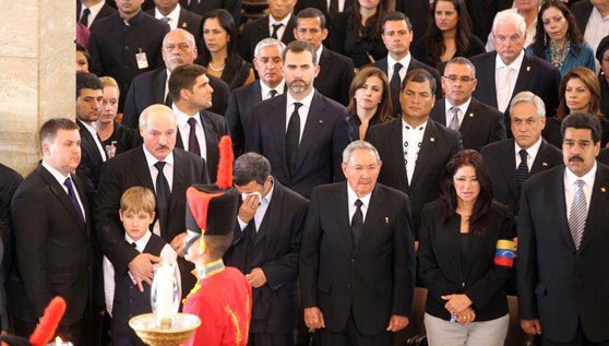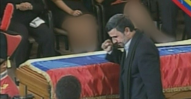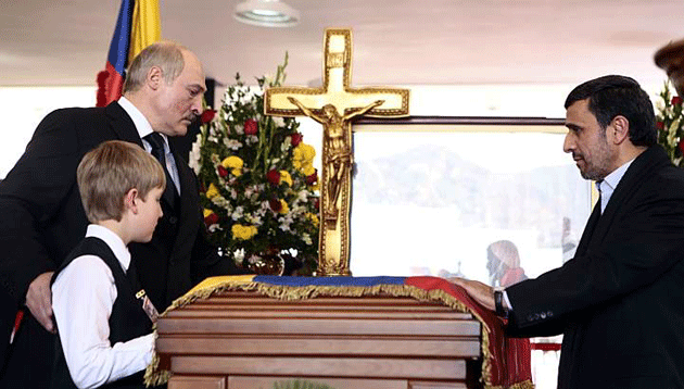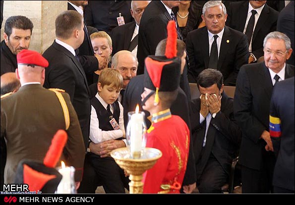 محمود احمدی نژاد و الکساندر لوکشانکو سران ایران و بلاروس در بالای تابوت هوگو چاوزبوسه احمدی نژاد بر تابوت چاوزاحمدی نژاد و مادر چاوز احمدی نژاد در مراسم وداع آخر با جنازه چاوزادای احترام رائول کاسترو رئیس جمهور کوبا به جنازه چاوزادای احترام رئیس جمهور برزیل به جنازه چاوزادای احترام سران بولیوی، اروگوئه و آرژانتین به جنازه چاوزادای احترام رئیس جمهور برزیل به جنازه چاوز