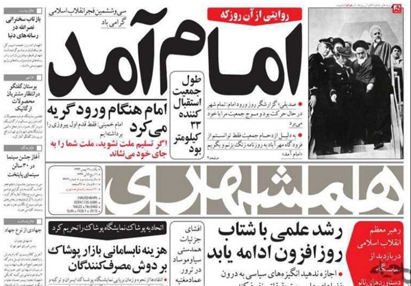 روزنامه همشهری در سی و ششمین سالگرد ورود حضرت امام خمینی(ره) به میهن در ابتکاری جالب، نیم صفحه اصلی روزنامه خود را به این واقعه تاریخی اختصاص داد.