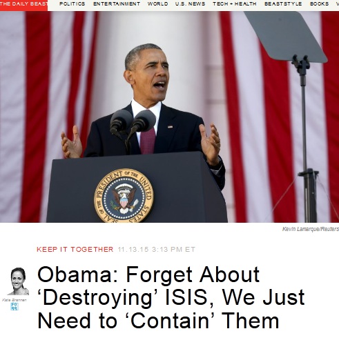 اوباما اگرچه خود را برای درگیری زمینی نظامیانش در خاک سوریه با داعش نگران نشان میداد اما این در حالی است که دو هفته ی پیش، حدود 50 نظامی دوره دیده ی امریکایی وارد خاک سوریه شده اند! اما برخی خبرگزاری ها مدعی شدند اوباما در اظهارات دیگری مدعی شده نابودی داعش را باید فراموش کرد! کنترل آن کافی است!