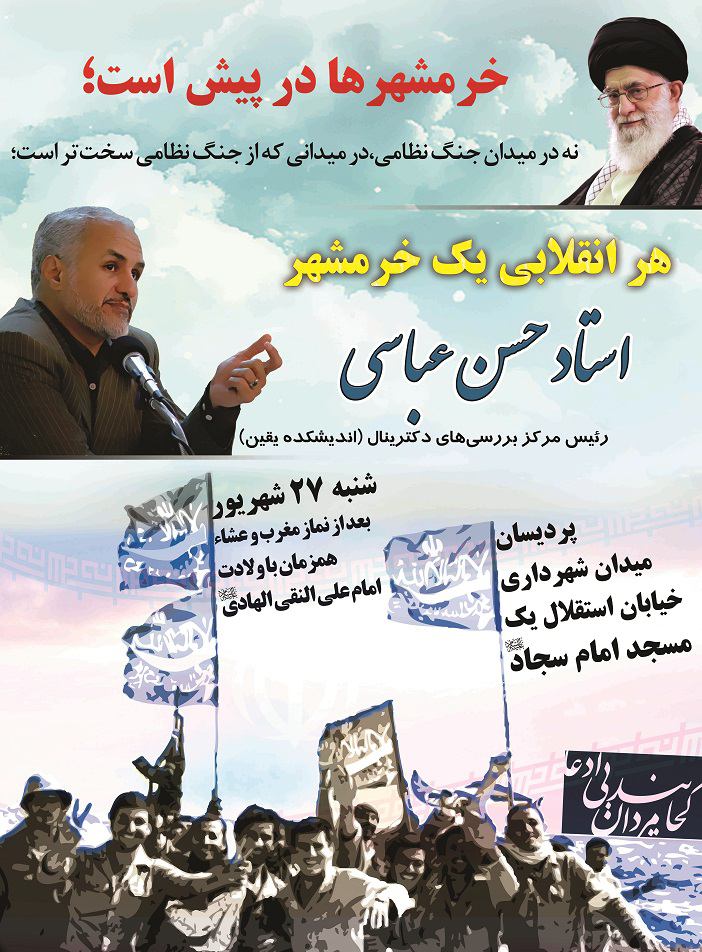 سخنرانی استاد حسن عباسی با موضوع هر انقلابی یک خرمشهر زمان: شنبه ۲۷ شهریور ۹۵، بعد از نماز مغرب و عشاء مکان: قم، پردیسان، میدان شهرداری، خیابان استقلال یک، مسجد امام سجاد(ع)