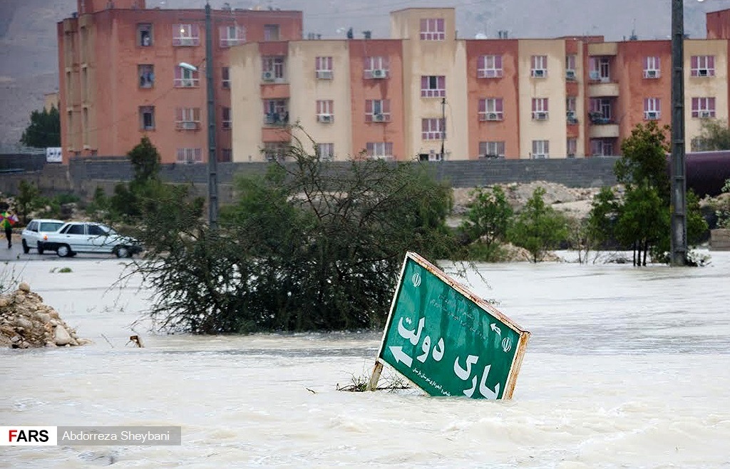 زیر اب نیست زیر برفه اگر دقت کنید چرخهای لاستیک پراید پیداست یعنی در کف خیابان خبری نیست و احتمالا برف داخل میدان یا محوطه پارک یا فضای سبز است که تابلو آن افتاده است.
