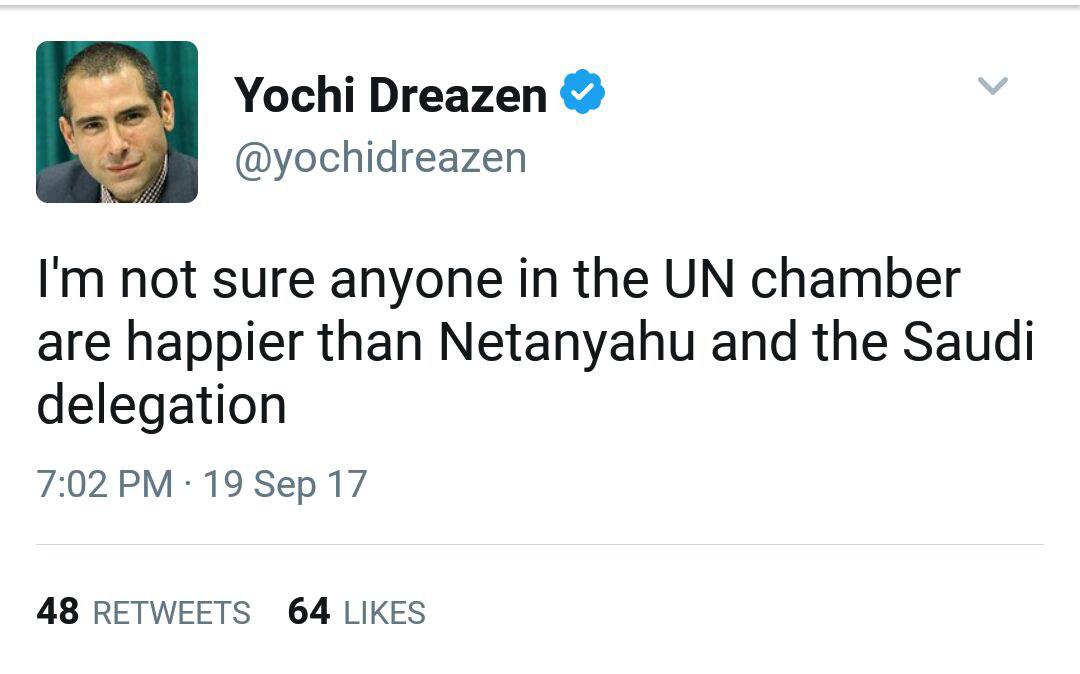 دبیر نشریه «ووکس» نیز اینگونه نوشت: احتمالا در مجمع عمومی هیچکس به اندازه نتانیاهو و هیئت سعودی [از سخنرانی ترامپ] خوشحال نیست.