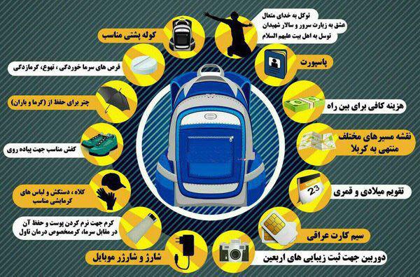 اطلاعاتی درمورد وسایل‌های ضروری سفر معنوی اربعین که در کوله پشتی خود باید قرار دهید را در این اینفوگرافیک تشریح کردیم.
