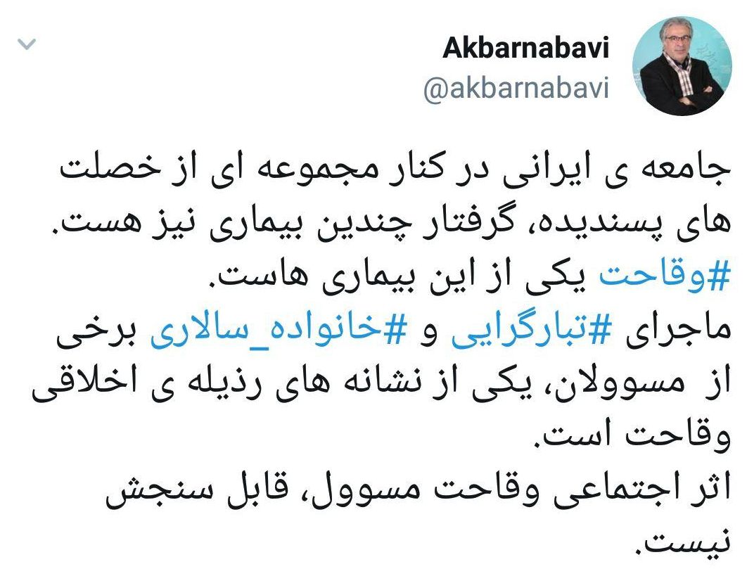 اکبر نبوی فعال رسانه طی توییتی درباره تبارگرایی و خانواده سالاری برخی از مسئولان نوشت: