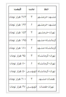 طبق اعلام شرکت راهآهن نرخ بلیت قطارهای ویژه اربعین حسینی (ع) در مسیرهای مشخص در زیر آورده شده است.