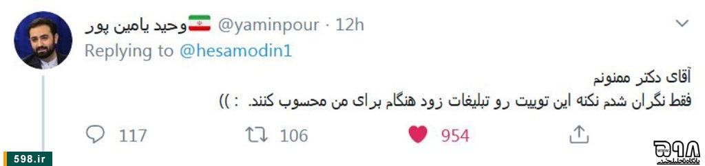 پاسخ یامین پور به توئیت حسام الدین آشنا
