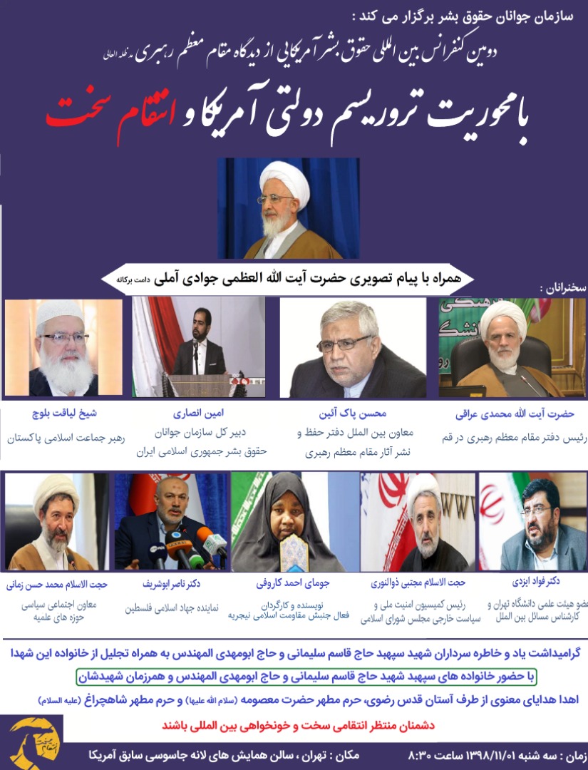 دومین کنفرانس بین المللی حقوق بشر امریکایی از دیدگاه مقام معظم رهبری با محوریت " تروریسم دولتی امریکا و انتقام سخت " با پیام تصویری مرجع عالیقدر جهان تشیع حضرت ایت الله العظمی جواد املی و با حضور خانواده شهید حاج قاسم سلیمانی و حاج ابومهدی المهندس و همرزمان شهیدشان شهید طارمی، شهید مظفری نیا، شهید زمانی نیا و شهید پور جعفری و تجلیل از خانواده این شهدا در تهران برگزار می شود.