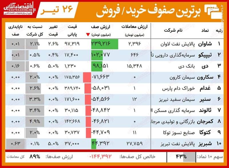 ارزش ۱۰صف خرید برتر بورس و فرابورس در مجموع ۶۵۰میلیارد تومان (۷۵درصد کل) و ۱۰صف فروش برتر ۴۶۰میلیارد تومان (۴۶درصد کل) می‌شود، همچنین حجم صف‌های خرید در ۱۷نماد و حجم صف‌های فروش در ۳۰نماد بیش از ۱۰میلیارد تومان بوده است؛ گفتنی است حجم صف لیزینگ رازی (ولراز) به ۵.۹درصد کل تعداد سهام آن می‌رسد.