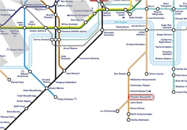 به گزارش باشگاه خبرنگاران اين عکس در سايت حمل ونقل ترافيک ويژه المپيک لندن منتشر شده است.در تصوير زير نقشه مترو لندن رو مشاهده ميکنيد که به مناسبت المپيک بر اساس نام قهرمانان ورزشي جهان نامگذاري شده است.