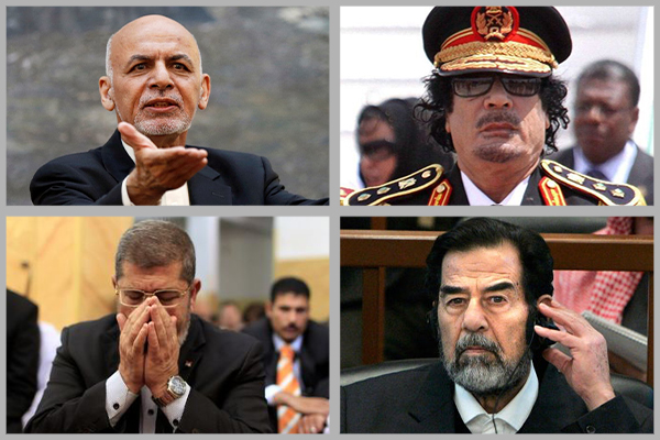 1- معمر قذافی، رئیس دولت لیبی: که در برخورد با آمریکا کم آورد . با فشار آمریکا و اعتماد به آمریکا و برجام ها خودش را بباد فنا داد. هم خودش کشته شد و هم کشور لیبی در جنگ داخلی فرو رفت و تنها برنده این حوادث آمریکا و اروپا بودند.