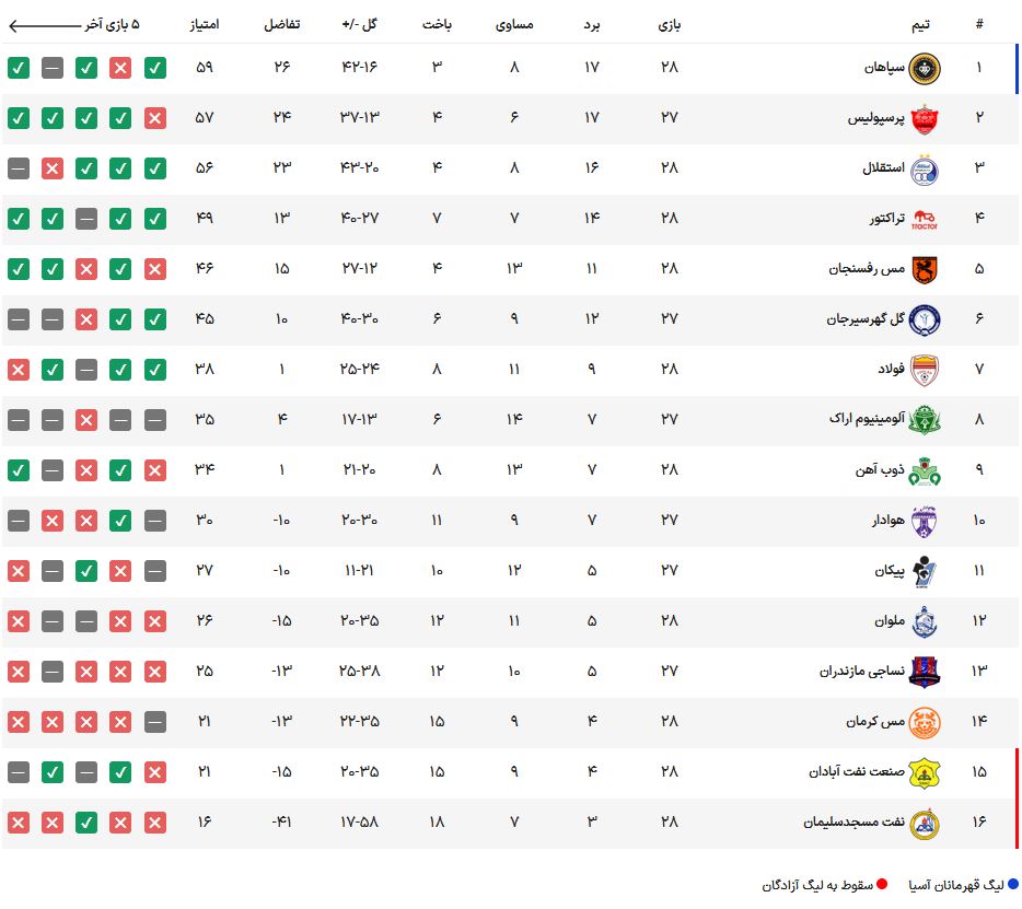 جدول رده بندی لیگ برتر در پایان روز نخست هفته بیست و هشتم