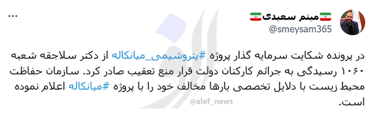در پرونده شکایت سرمایهگذار پروژه پتروشیمی میانکاله از رئیس سازمان حفاظت محیط زیست، شعبه ۱۰۶۰ رسیدگی به جرایم کارکنان دولت قرار منع تعقیب صادر کرد. میثم سعیدی، مدیرکل روابط عمومی سازمان حفاظت محیط زیست در این رابطه در صفحه شخصی خود در توئیتر نوشت: در پرونده شکایت سرمایهگذار پروژه پتروشیمی میانکاله از دکتر سلاجقه، شعبه ۱۰۶۰ رسیدگی به جرایم کارکنان دولت قرار منع تعقیب صادر کرد.