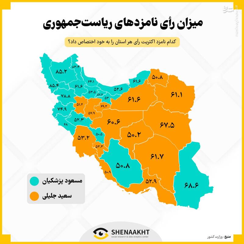 به گزارش پایگاه خبری 598، نتایج آرا نشان میدهد مسعود پزشکیان در استانهای آذربایجان غربی، آذربایجان شرقی و اردبیل بیشترین درصد آرا را به خود اختصاص داده و در مقابل استانهای قم، خراسان جنوبی و کرمان بیشترین رأی را به سعید جلیلی دادهاند.