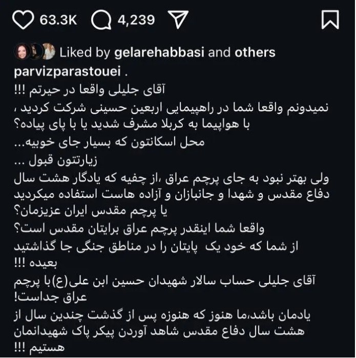 پرویز پرستویی با انتشار یک استوری که رسانهها از آن به عنوان «متن پرکنایه» این بازیگر سینما یاد میکنند، نسبت به انداختن پرچم عراق دور گردنش انتقاد کرده است.