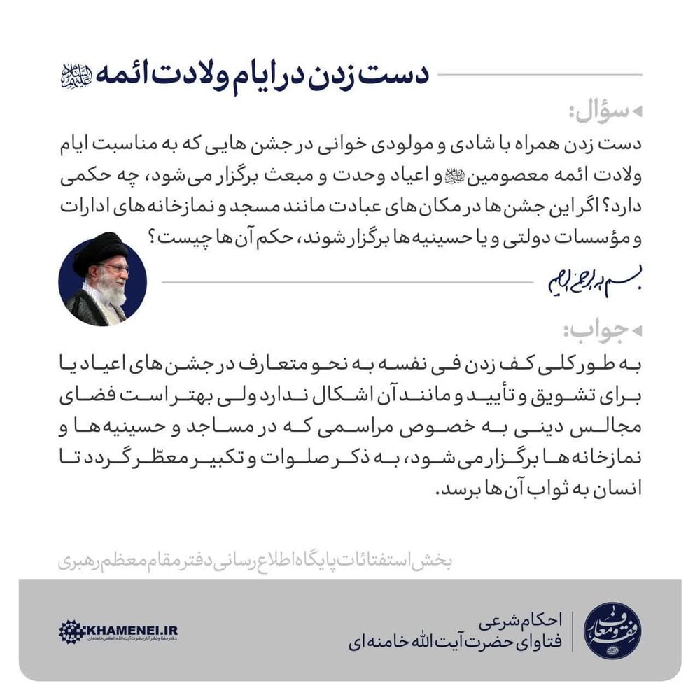 به گزارش پایگاه خبری 598، حضرت آیت الله خامنه ای نظر خود را پیرامون «دستزدن در شادی اهلبیت (ع)» اعلام کردند که تقدیم حضور علاقه مندان می گردد.