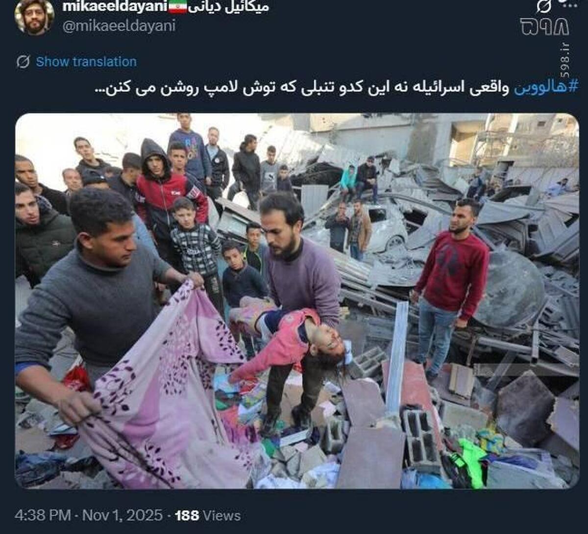 یک کاربر در فضای توئیتر نوشت: هالووین واقعی اسرائیله نه این کدو تنبلی که توش لامپ روشن می کنن…