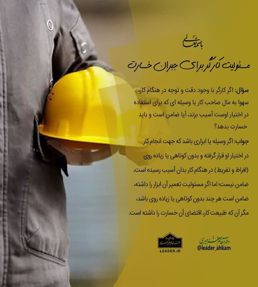 استفتاء حاضر به بررسی این موضوع کلیدی و تعیین حدود مسئولیت کارگر میپردازد و حضرت آیتالله العظمی خامنهای به این استفتا پاسخ دادهاند که تقدیم حضور علاقهمندان میگردد.