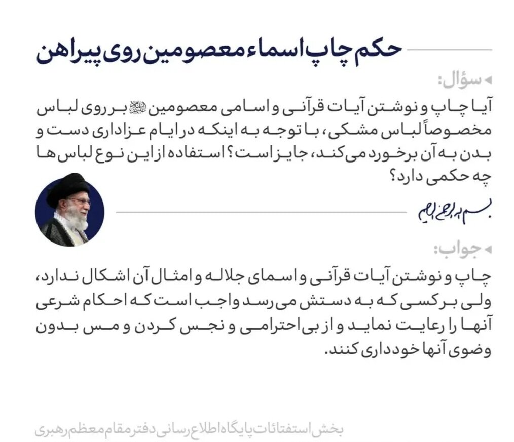 به گزارش پایگاه خبری 598، در ایام عزاداری و به ویژه در مراسم مذهبی، یکی از راههای ابراز ارادت و ایجاد حس معنوی، استفاده از البسهای است که منقش به آیات قرآن کریم، اسامی پروردگار و نامهای مطهر ائمهی معصومین (علیهمالسلام) میباشد. این عمل اگرچه از روی محبت و علاقهی قلبی انجام میشود، اما از آنجا که این نامها و آیات از حرمت و قداست ویژهای برخوردارند، رعایت احکام شرعی مربوط به آنان ضروری است.