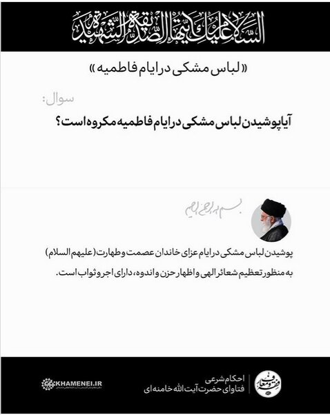 بر همین اساس، پرسشی درباره حکم شرعی پوشش لباس مشکی در این ایام مطرح گردیده که آیتالله العظمی خامنهای به آن پاسخ داده اند که تقدیم حضور علاقهمندان میگردد.