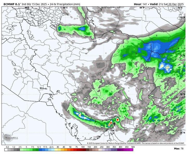 ضیائیان گفت: الگوی بارشها در روز پنجشنبه (۲۷ آذر) تا حد زیادی مشابه روز چهارشنبه است و اغلب استانهای کشور بهجز استانهای سیستان و بلوچستان، آذربایجان غربی و آذربایجان شرقی، بارش خواهند داشت. در این روز، در استان کهگیلویه و بویراحمد مخاطره سیلابی شدن مسیرها وجود دارد و بارشهای سنگین برای این استان پیشبینی میشود.
