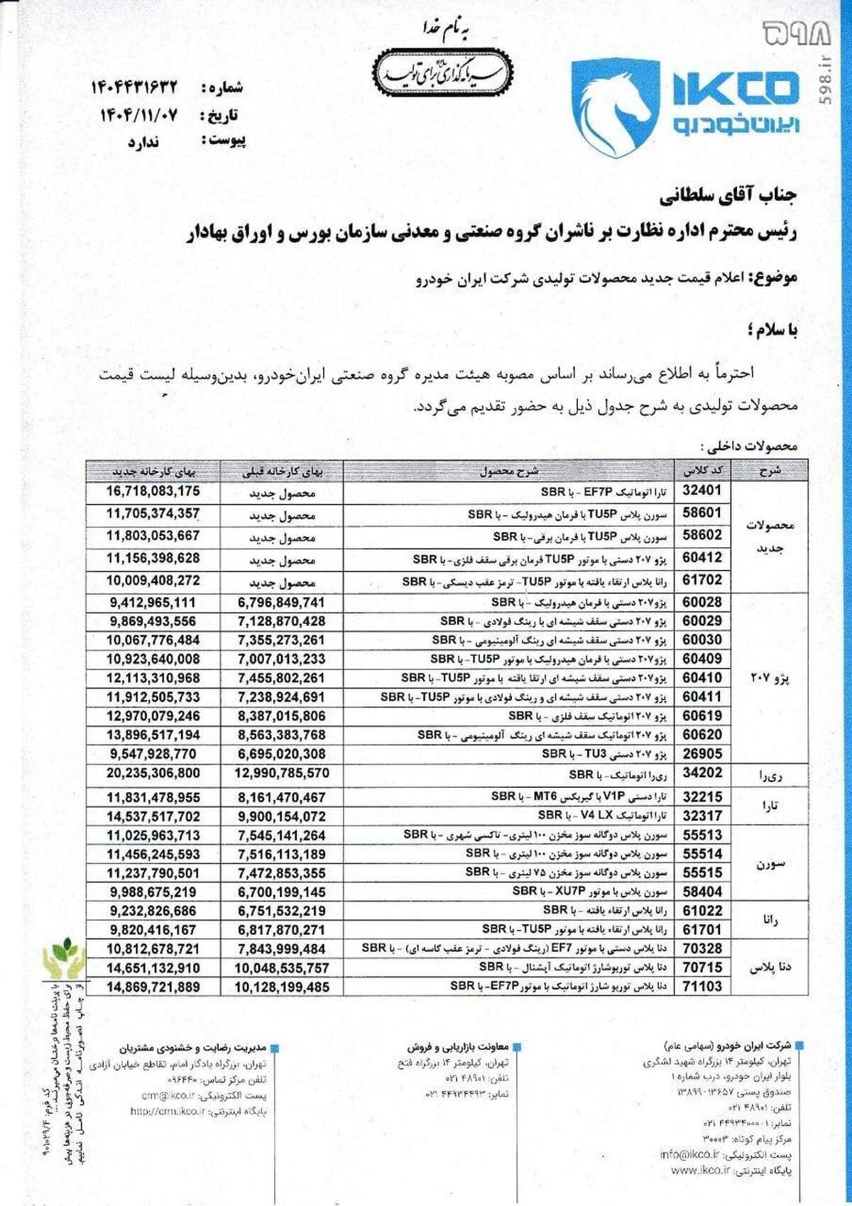 لیست نهایی قیمت کارخانه ای محصولات ایران خودرو ویژه بهمن 1404 از سوی این شرکت اطلاع رسانی شد. قیمت های فوق بدون احتساب هزینه های جانبی است و به قیمت نهایی مصرف کننده اضافه خواهد شد.