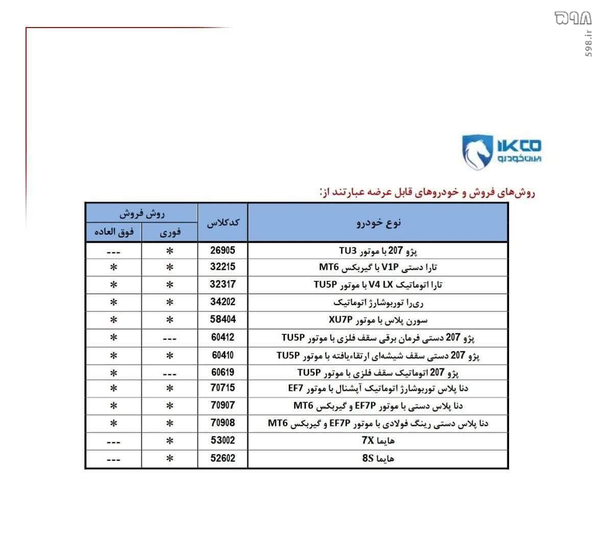 براساس این گزارش؛ در این مرحله، خودرو‌های پژو ۲۰۷ TU ۳، تارا دستی V ۱، تارا اتوماتیک V ۴ با موتور TU ۵ P، ری‌را، سورن پلاس XU ۷ P، پژو ۲۰۷ دستی سقف فلزی TU ۵ P، پژو ۲۰۷ دستی سقف شیشه‌ای TU ۵ P، پژو ۲۰۷ اتوماتیک سقف فلزی، دنا پلاس توربوشارژ اتوماتیک، دنا پلاس دستی EF ۷ P، دنا پلاس دستی EF ۷ P رینگ فولادی، هایما X ۷ و هایما ۸ S عرضه می‌شوند.