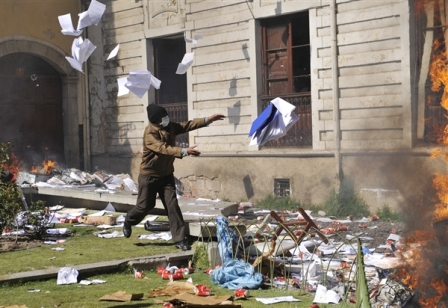 مقر اداره اطلاعات ملی در پایتخت بولیوی، شیشه های آن را شکستند و اسناد و